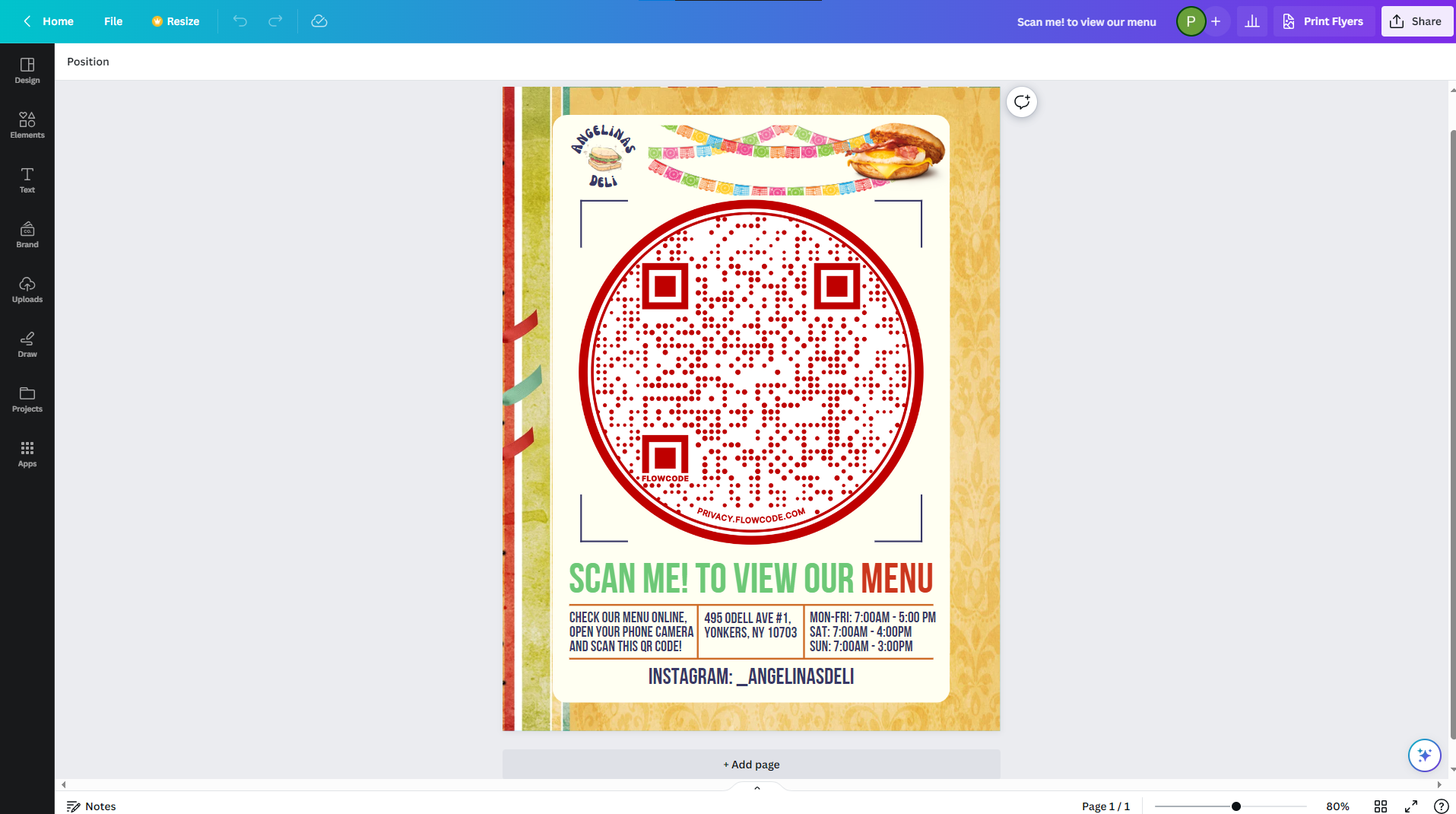 The initial menu did not specify direct seperation of the food items and so for each board, a subset of items are contained within their own block of course all falling under the same overall category. Important Note: For the sake of minimizing storage space, the animated showcases have been shortened to 4 seconds per 'transition' (that is board to 'highlight item'). The actual time frame implemented is an interval of 30 seconds between transition. For user convenience, QR CodeDesign ExplanationThe design of this QR Code flier was taken from the already implemented 'Mexican Food' board. This was a choice done so from the owner of the establishment pride in his ethnicity and what he has to offer. The scanning of this code takes you to the static menus of all boards without the 'highlight item' concept. This was done so in an effort to minimize customer displeasure at having to wait an interval to read their desired menu again. Additionaly, it was done so to help in advertising the food options the establishment offers as there was no such system in place before. Scanning the QR code is possible from this image. |