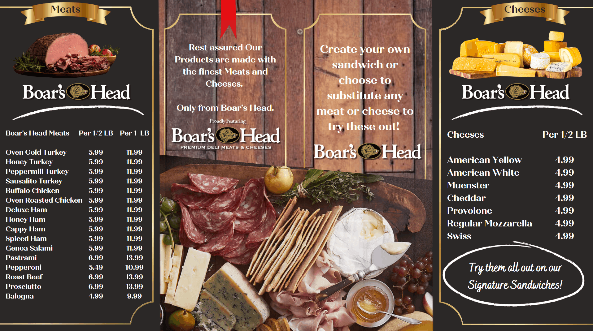 Initial InquiryAngelina's Delicatessen InquiryAngelina's Delicatessen contacted me with an inquiry on June 2022 about a quota for designing and implementing dynamic menu systems to replace their current static wall menu system. A 'test sample' menu was requested, using a concept image the owner liked on youtube for their newly installed juice bar. I inquired if the delicatessen would like custom images of their food items or if stock images would suffice in order to prepare my camera gear. The feedback was stock images. My goal then was to take that image along with their entire juice bar menu and give it life. The showcased image above is the client sample sent to me. Below it is the gif image I responded with. Angelina's Delicatessen Test Sample ResponseThe main goal of the recreation was to capture the feel of their juice bar based on their menu. The menu largely consisted of organic choices and so the color pallet I choose was a color closer to orange than was sent, off-white, and a transparent teal. A bubble background was incorporated to highlight the use of berries prevalent in many of their menu items as well as the tapioca used for the bubble tea menu item. I also included a sample of 'highlighted menu item' boards to transition between the menu and these highlighted items based on the delicatessen's most popular items. Orange was used as a background bubble behind prices to make them better pop as opposed to the dullness of the image sent. Project DescriptionAngelina's Delicatessen Job RequestAfter the initial test sample, Angelina's Delicatessen requested a quota for a 5 story board menu package in hopes of transitioning from their static menu board wall system. Once negotiations were settled, I was tasked with designing and implementing 3 original story board menus for breakfast, lunch and mexican food. Additionally there was a 'required' story board that needed to be designed and implemented. Mandatory Sponsor Menu - Boar's HeadAs the delicatessen is sponsored by Boar's Head, they were required to have a story board dedicated soley to Boar's head. This came with a unique opportunity to use a concept image on the official Boar's head website to act as a template for the menu. This image was designed originally as a 'Craft A Gourmet Charcuterie Board' and is showcased to the right, and with this I gave the final statement of work to Angelina's Delicatessen. Summary of Statement of Work